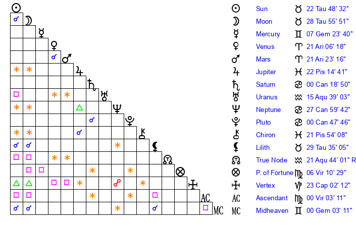 | Moon | 28 Taurus 53 | 16 Sagittarius 18 | 9 Gemini 10 |