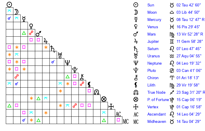 Moon | 3 Libra 42 | 6 Pisces 54 | 6 Virgo 28 |