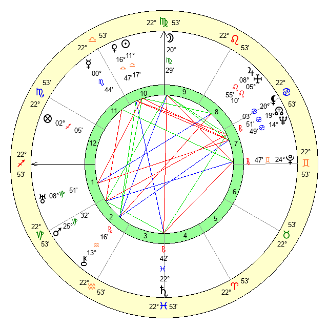 | Moon | 20 Virgo 32 | 22 Pisces 50 | 17 Capricorn 12 |