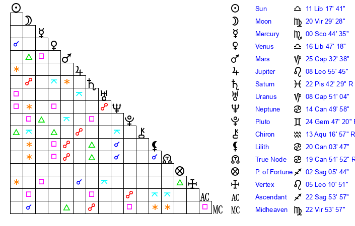 | Moon | 20 Virgo 32 | 22 Pisces 50 | 17 Capricorn 12 |