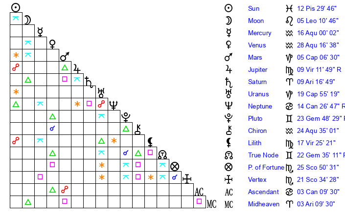 | Sun | 12 Pisces 30 | 13 Pisces 22 | 5 Cancer 22 |