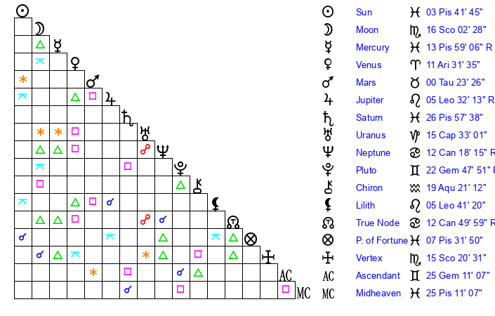 | Sun | 3 Pisces 42 | 5 Pisces 20 | 27 Gemini 58 |