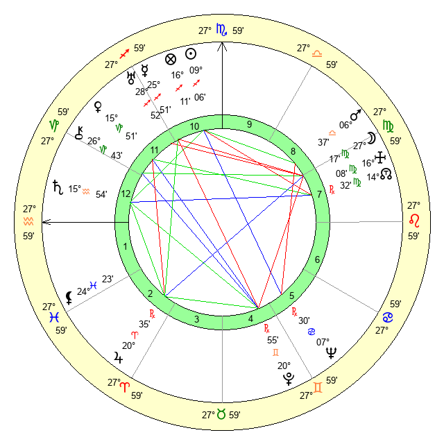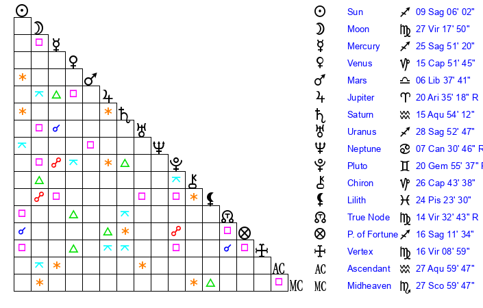 | Moon | 27 Virgo 19 | 15 Sagittarius 10 | 23 Aquarius 54 |
