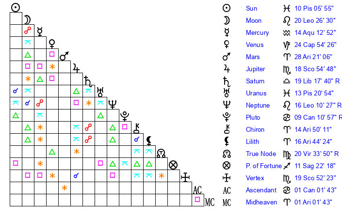 Sun | 10 Pisces 6 | 11 Pisces 22 | 19 Gemini 44 |