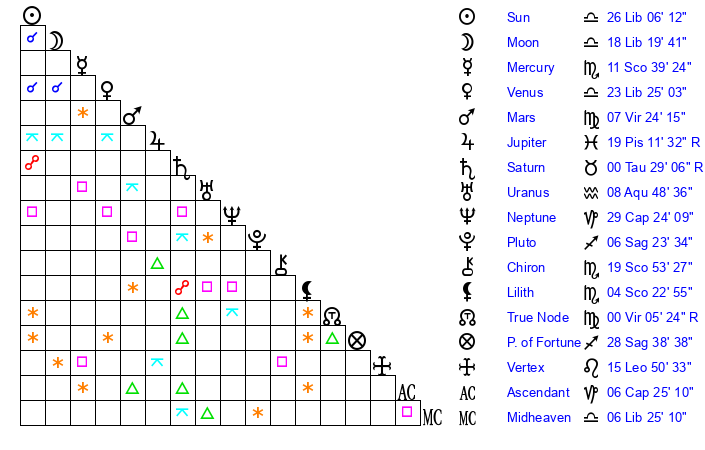 | Sun | 26 Libra 6 | 26 Libra 34 | 23 Scorpio 8 |
