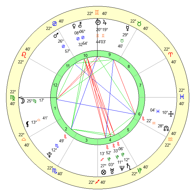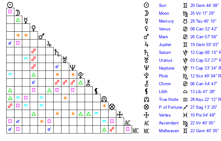 | Moon | 25 Virgo 18 | 25 Sagittarius 28 | 12 Capricorn 9 |