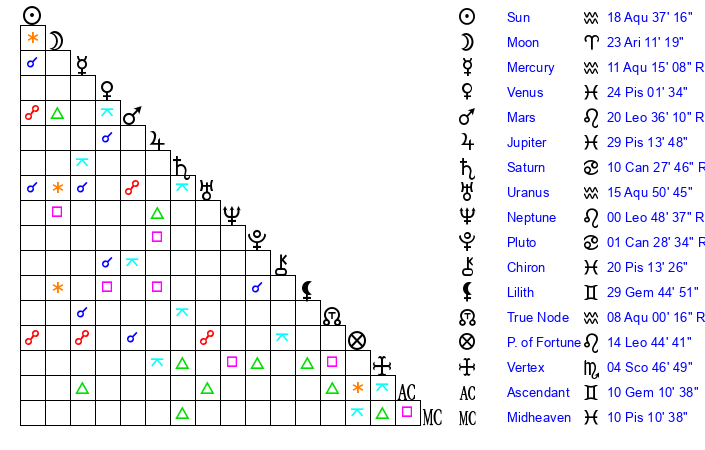 | Moon | 23 Aries 14 | 3 Cancer 23 | 18 Aries 49 |