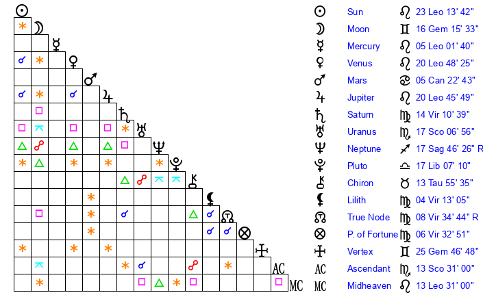 | Sun | 23 Leo 14 | 24 Leo 5 | 7 Libra 55 |