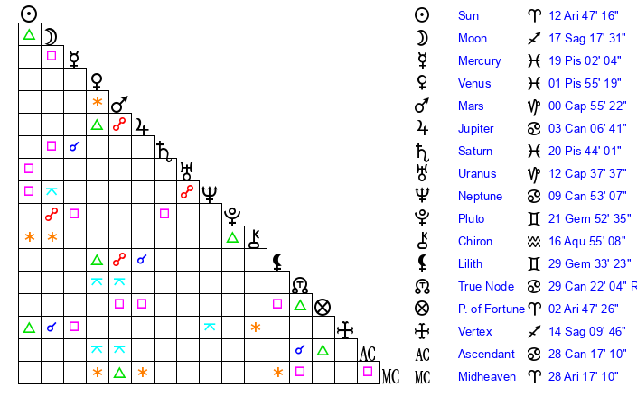 | Sun | 12 Aries 47 | 14 Aries 11 | 6 Leo 21 |