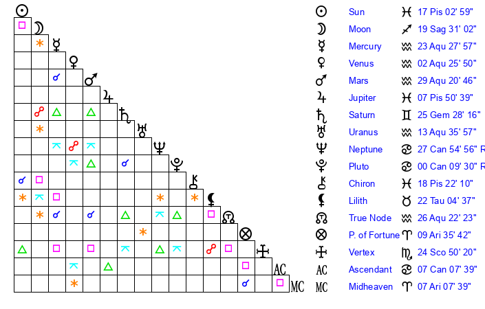 | Moon | 19 Sagittarius 31 | 13 Cancer 43 | 27 Sagittarius 15 |