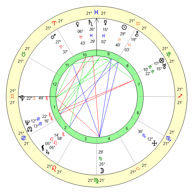 | Sun | 29 Aquarius 40 | 1 Pisces 18 | 24 Gemini 9 |