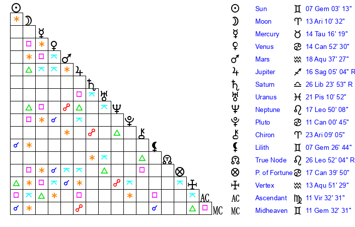 Moon | 13 Aries 6 | 29 Gemini 42 | 18 Sagittarius 17 |