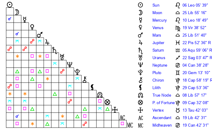 | Sun | 6 Leo 5 | 7 Leo 32 | 6 Sagittarius 3 |