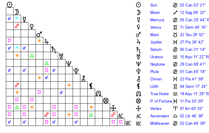 | Moon | 12 Sagittarius 8 | 8 Cancer 1 | 24 Sagittarius 29 |