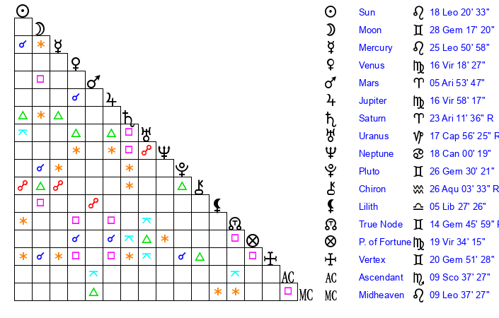 | Sun | 18 Leo 21 | 19 Leo 16 | 12 Sagittarius 57 |