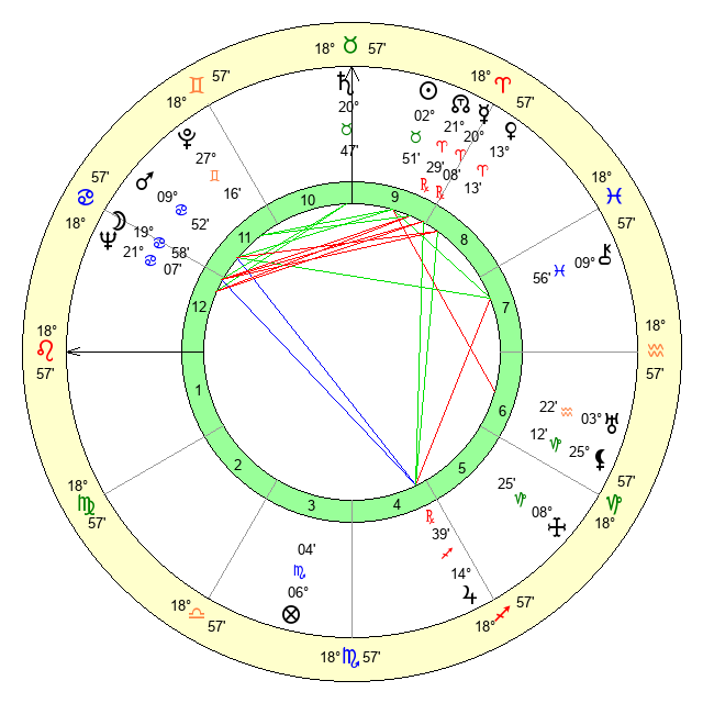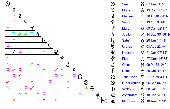 | Moon | 25 Taurus 20 | 29 Capricorn 13 | 20 Cancer 4 |