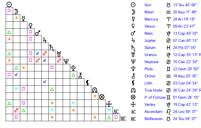 | Moon | 20 Aquarius 12 | 25 Leo 4 | 14 Gemini 36 |