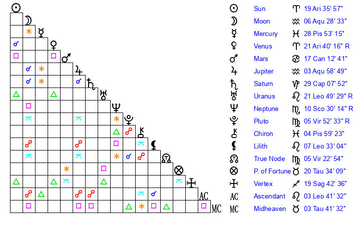 | Moon | 6 Aquarius 32 | 13 Virgo 48 | 15 Gemini 23 |