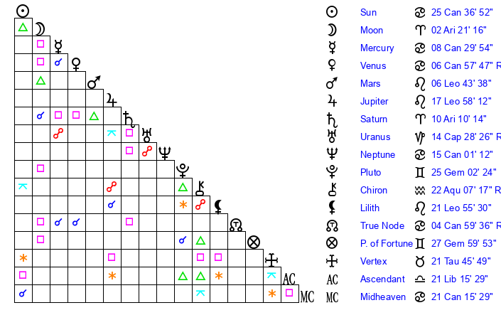 | Moon | 2 Aries 21 | 5 Taurus 14 | 13 Cancer 34 |