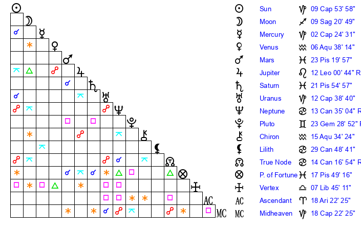 | Sun | 9 Capricorn 54 | 11 Capricorn 32 | 7 Taurus 1 |