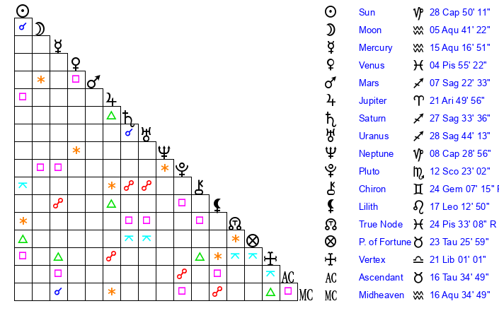 | Mercury | 15 Aquarius 17 | 16 Capricorn 43 | 12 Aquarius 53 |