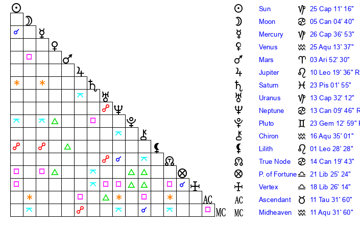 | Venus | 25 Aquarius 14 | 13 Pisces 50 | 5 Cancer 58 |