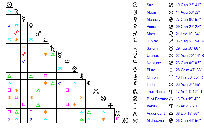 | Moon | 14 Aquarius 50 | 9 Libra 59 | 1 Aries 54 |