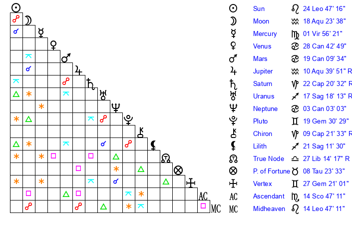 | Sun | 24 Leo 47 | 26 Leo 0 | 26 Sagittarius 53 |