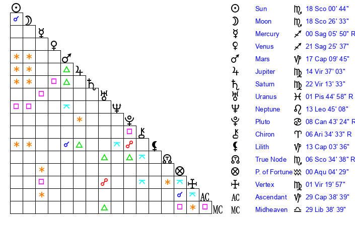 Moon | 18 Scorpio 20 | 7 Pisces 40 | 7 Virgo 55 |
