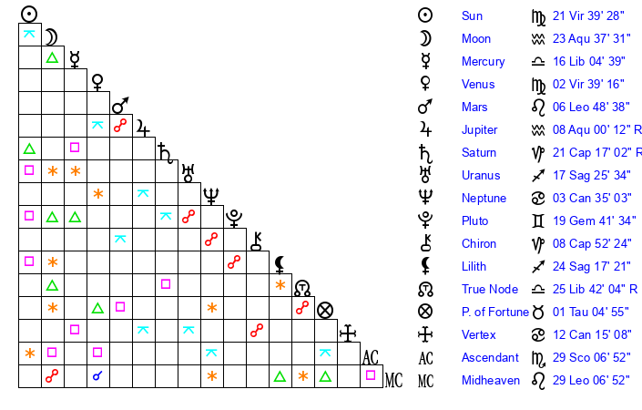 | Venus | 2 Virgo 39 | 25 Leo 2 | 6 Aquarius 44 |