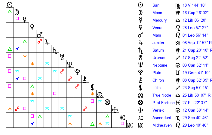 | Sun | 18 Virgo 44 | 19 Virgo 56 | 22 Capricorn 6 |