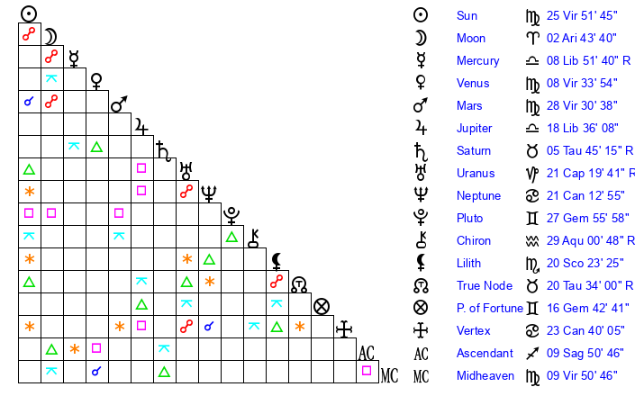 | Moon | 2 Aries 35 | 2 Virgo 17 | 20 Gemini 56 |