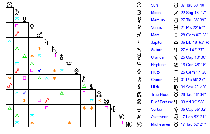 | Moon | 22 Sagittarius 45 | 21 Taurus 28 | 9 Pisces 28 |
