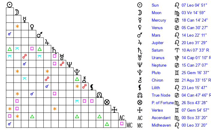 | Jupiter | 20 Leo 21 | 11 Cancer 27 | 12 Virgo 20 |