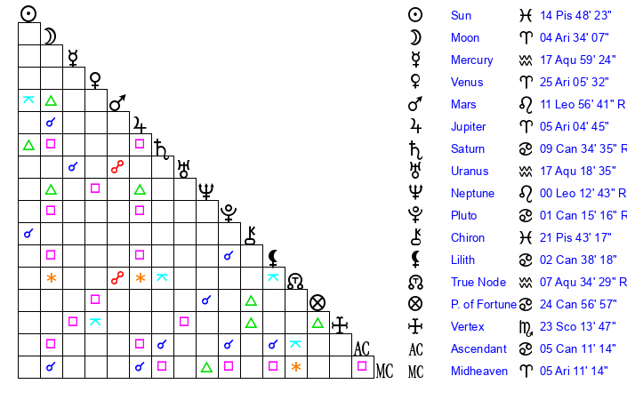 | Mercury | 17 Aquarius 59 | 3 Aries 12 | 11 Gemini 33 |
