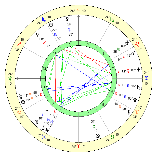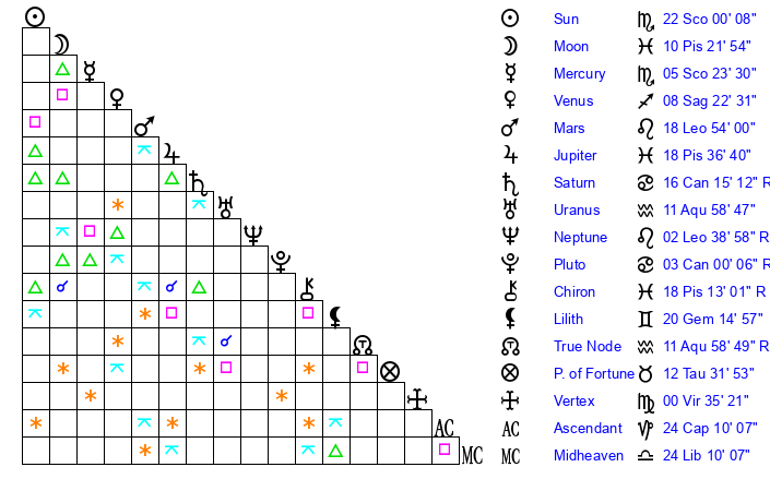 | Sun | 22 Scorpio 0 | 23 Scorpio 34 | 12 Pisces 33 |
