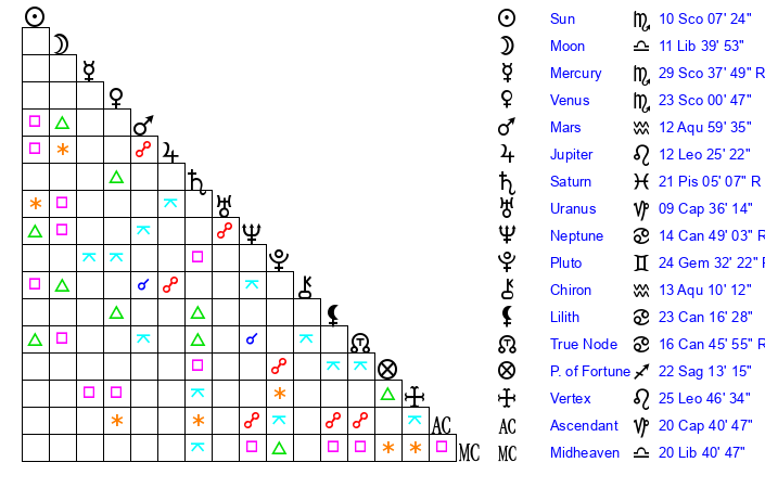 | Sun | 10 Scorpio 8 | 11 Scorpio 46 | 8 Pisces 44 |