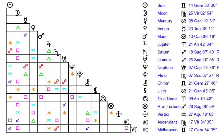 | Sun | 14 Gemini 30 | 15 Gemini 17 | 20 Cancer 46 |