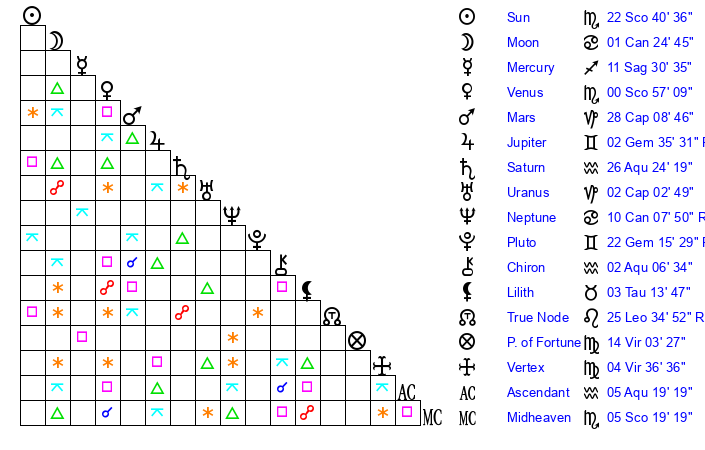 | Sun | 22 Scorpio 41 | 23 Scorpio 49 | 23 Pisces 13 |
