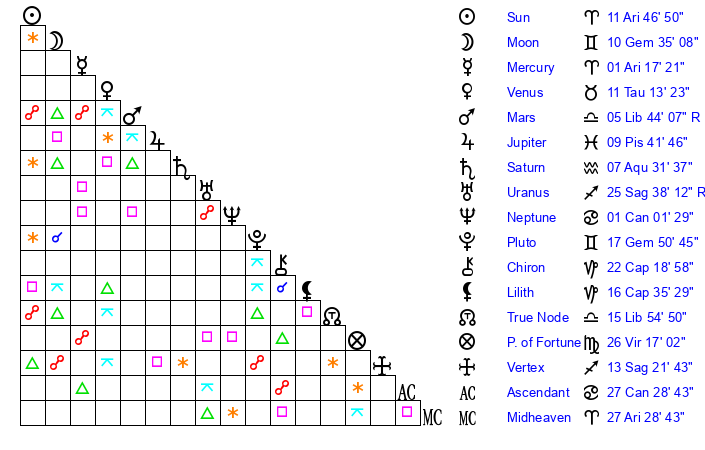 | Sun | 11 Aries 47 | 13 Aries 12 | 9 Leo 12 |