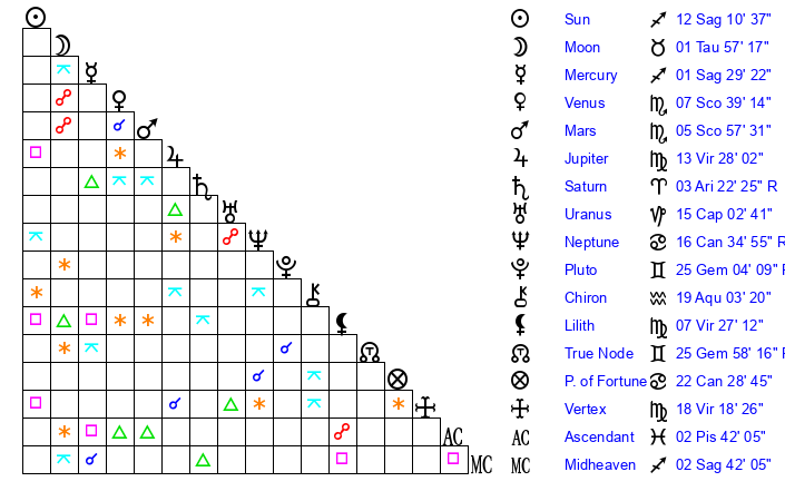| Sun | 12 Sagittarius 11 | 13 Sagittarius 2 | 9 Aries 21 |