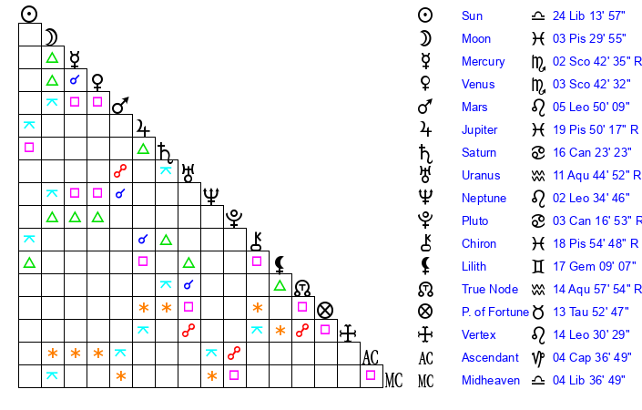 | Moon | 3 Pisces 26 | 24 Virgo 15 | 12 Pisces 53 |