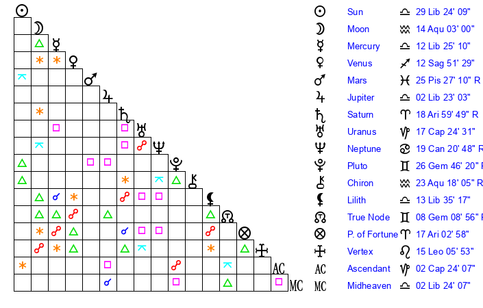 | Sun | 29 Libra 24 | 0 Scorpio 17 | 26 Aquarius 55 |
