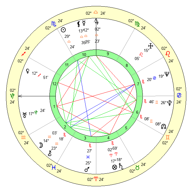 | Jupiter | 2 Libra 12 | 24 Cancer 34 | 13 Libra 48 |
