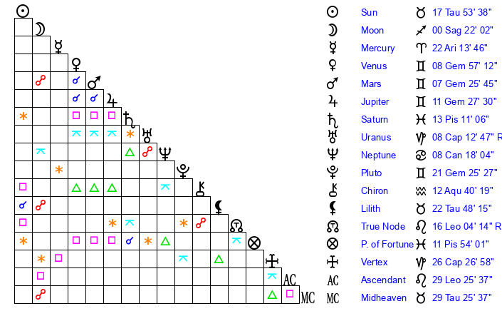 | Pluto | 21 Gemini 26 | 3 Aquarius 48 | 23 Gemini 43 |