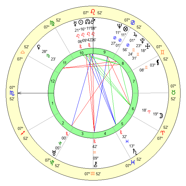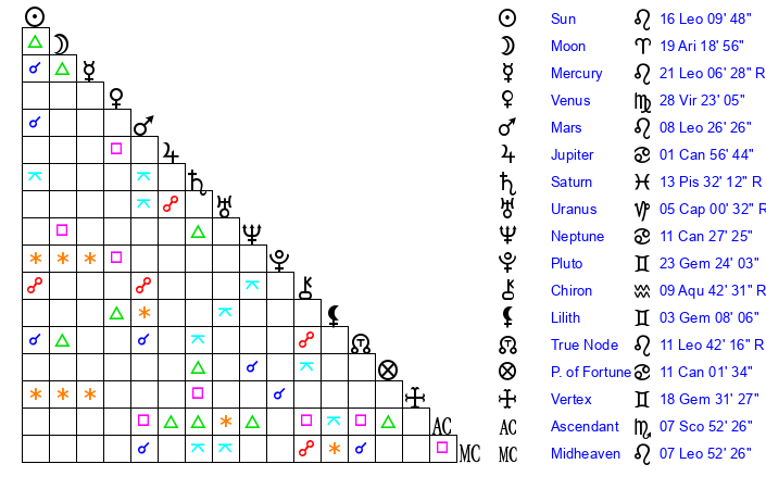 | Moon | 19 Aries 25 | 22 Aquarius 9 | 16 Leo 18 |