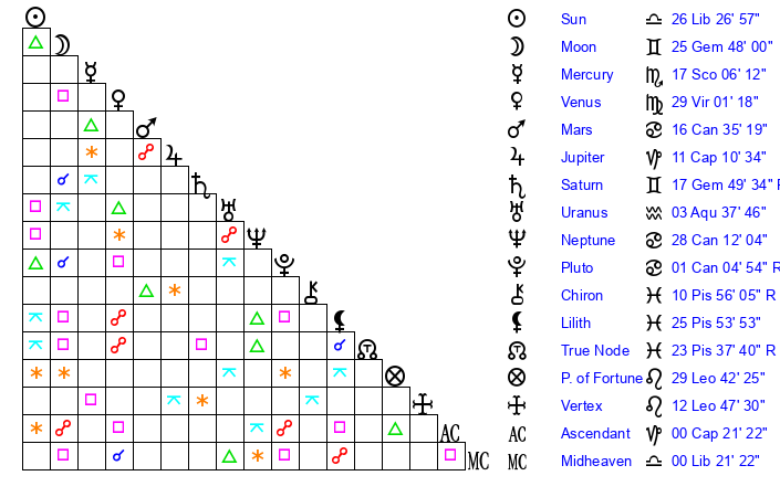 | Sun | 26 Libra 27 | 27 Libra 18 | 19 Aquarius 52 |
