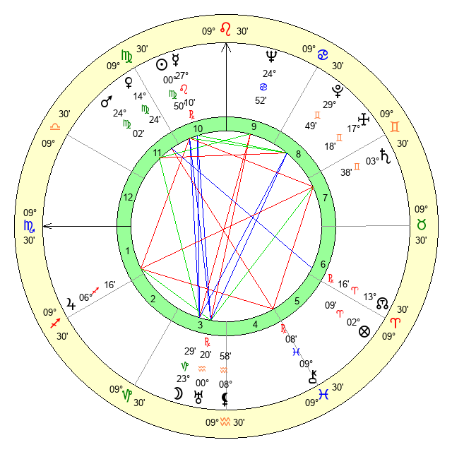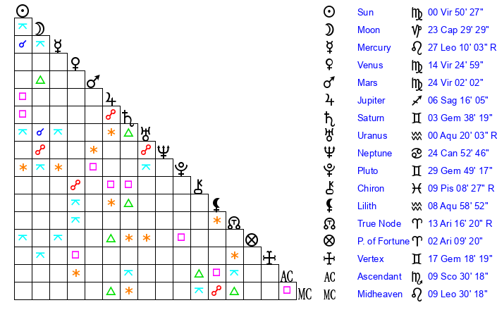 | Mercury | 27 Leo 10 | 14 Leo 10 | 9 Sagittarius 23 |