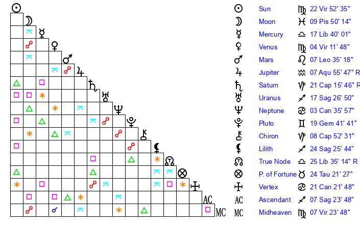 | Sun | 22 Virgo 52 | 24 Virgo 5 | 26 Capricorn 26 |