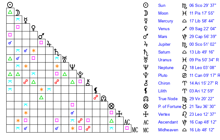 Moon | 11 Pisces 24 | 17 Libra 57 | 6 Sagittarius 52 |